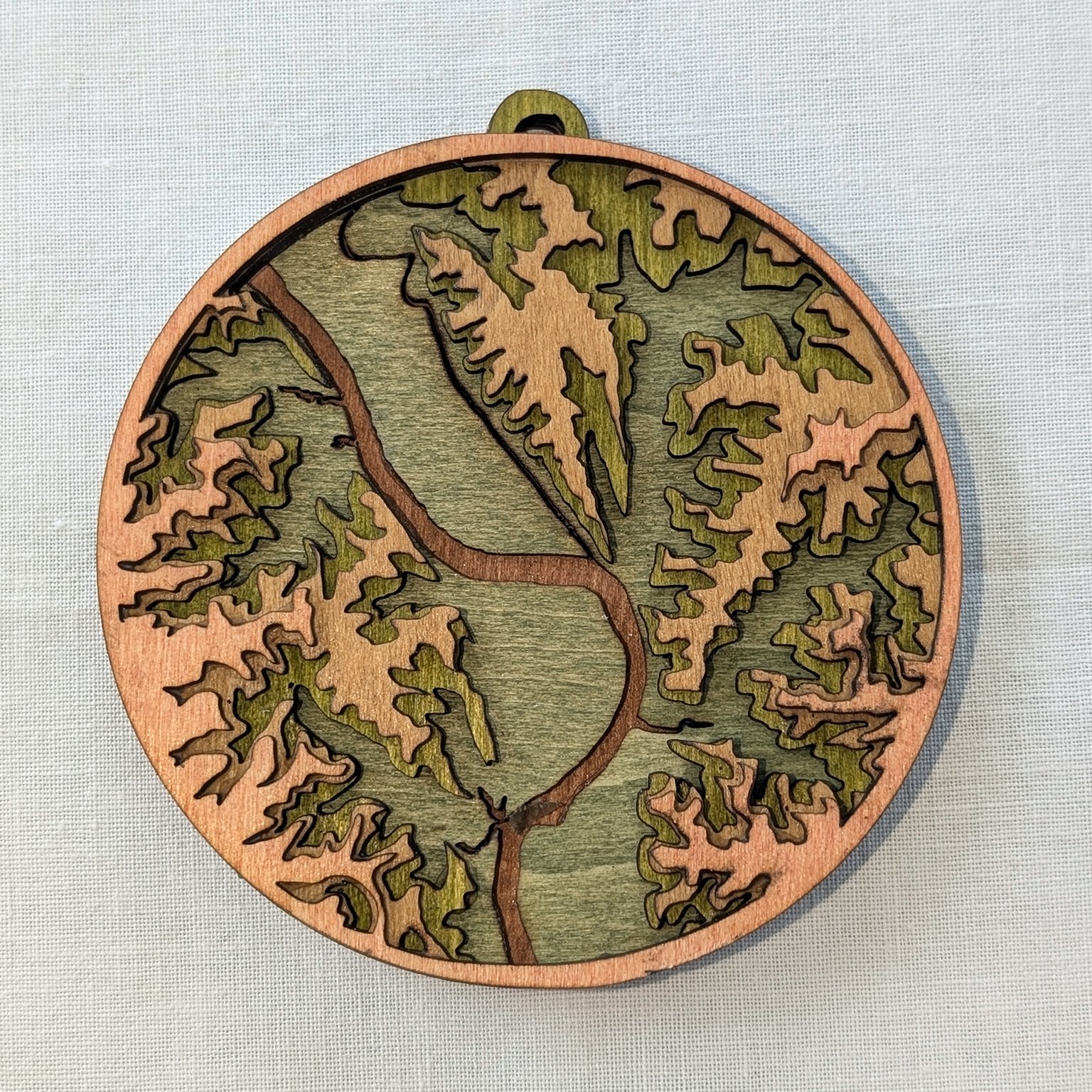 A little round map of the Easley area in southwest Boone County, Missouri with four levels of elevation. Hang it as an ornament or stick it to your fridge!