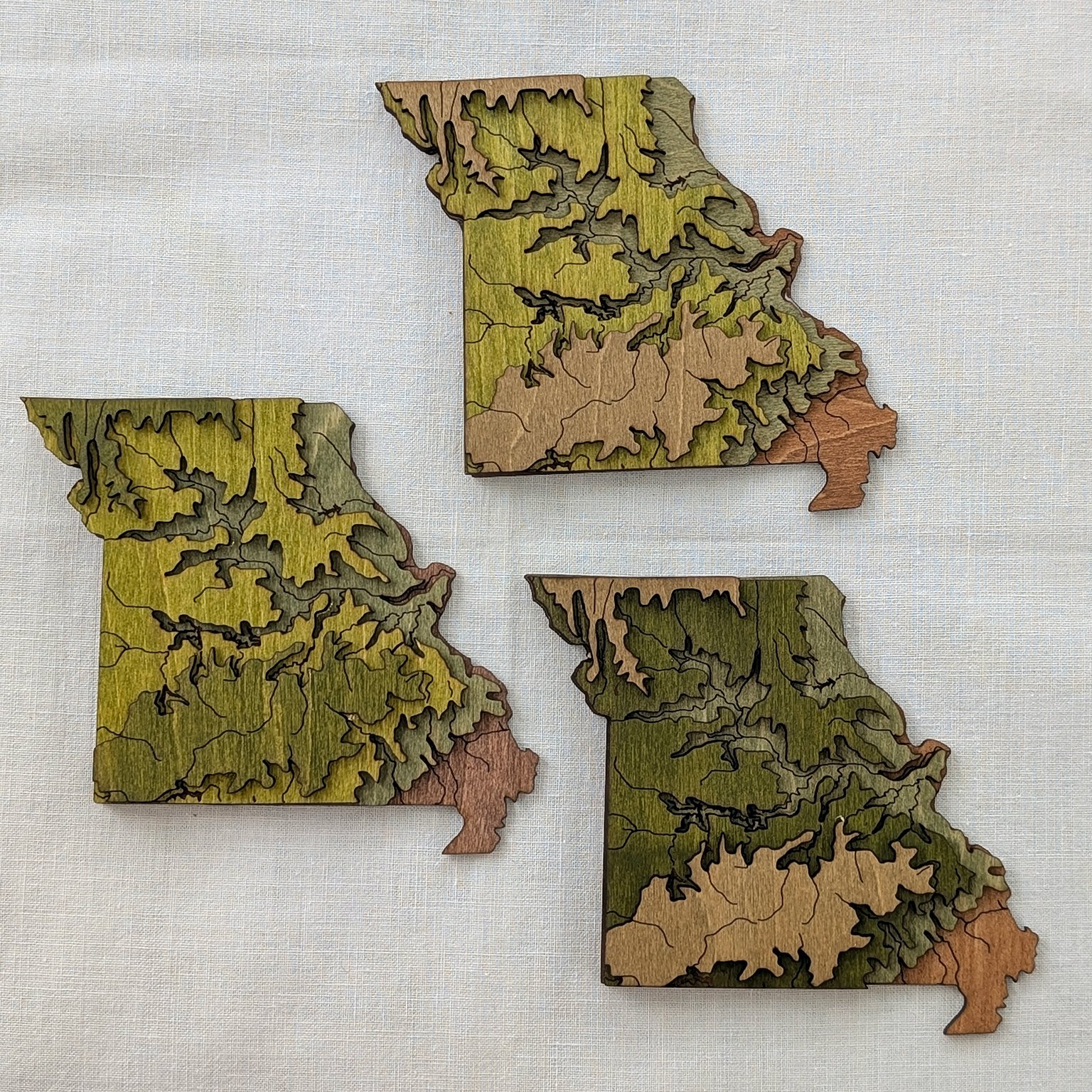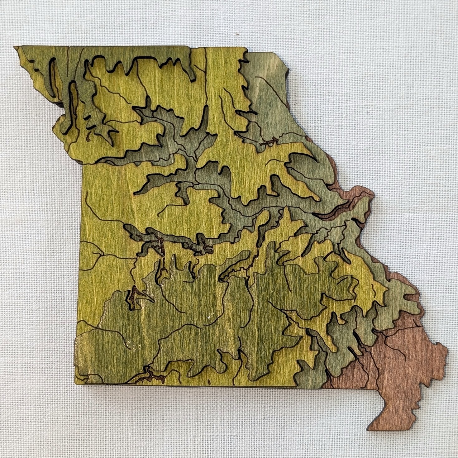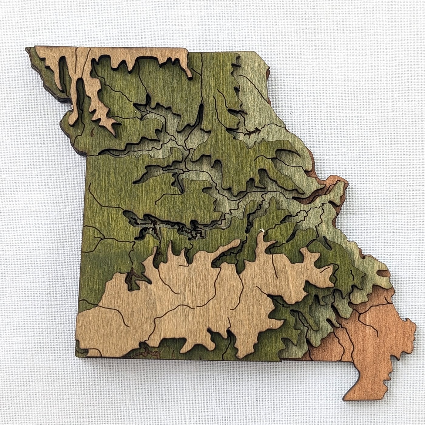 A little Missouri map with four levels of elevation. Hang it as an ornament or stick it to your fridge! Clearly shows the Ozark plateau and escarpment.