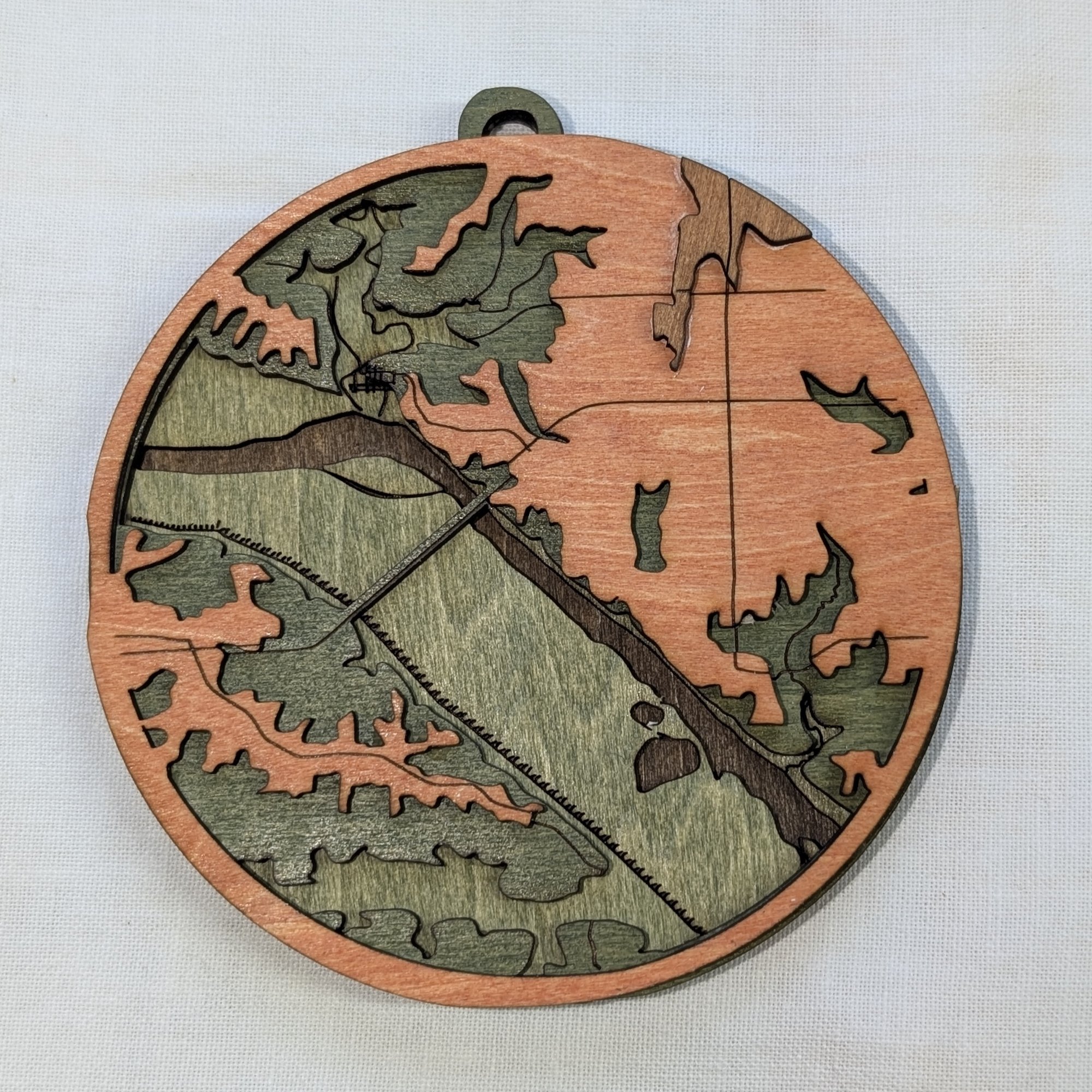 A little round map of an area in the vicinity of Rocheport, Boone County, Missouri with four levels of elevation. Hang it as an ornament or stick it to your fridge!